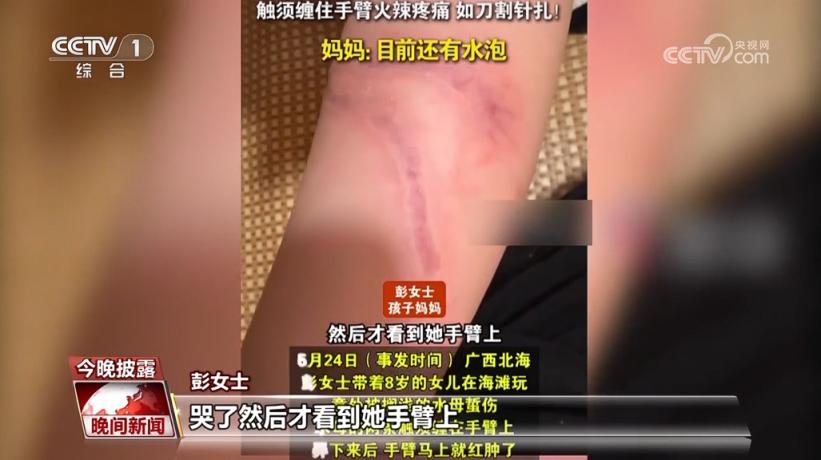彭女士:(孩子)在旁边浅的地方玩了一会,她就哭了,哭了然后才看到她手臂上有两条透明的触须,我就用雨伞把它刮开了,手就立马红肿了。